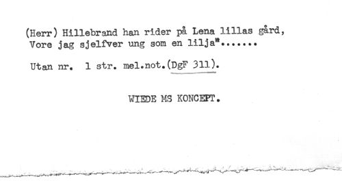 //// (Herr) Hillebrand han rider på Lena lillas gård, //// Vore jag sjelfver ung som en lilja"....... //// Utan nr. 1 str. mel.not.(DgF 31l). //// WIEDE M3 KONCEPT. ////