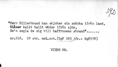 //// "Herr Hillerbrand han skjuter sin snacka ifrån land. //// Blåser kallt kallt wäder ifrån sjön, //// Se'n segla de sig till haffrunens strand"....... //// nr.218. 19 str. mel.not.(DgF 380 jfr.: DgF378) //// f //// WIEDE MS. //// < //// ^ ! ////