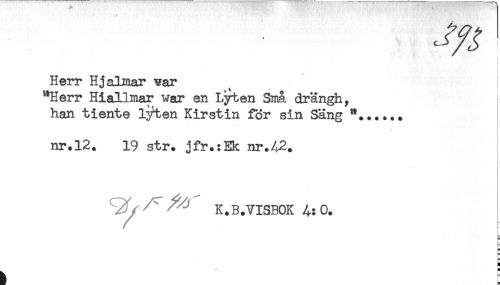 //// : //// Herr Hjalmar *var //// "Herr Hiallmar war en Lyten Små drängh, //// han tiente l^ten Kirstin för sin Säng //// nr.12. 19 str. jfr.:Ek nr.42. //// K.B.VISBOK 4:0. //// r ////