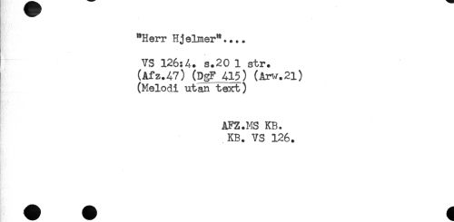 //// "Herr Hjelmer".... //// VS 126:4. s.20 1 str. //// (Afz.A7) (DgF 415) (Arw.2i) //// (Melodi utan text) //// AFZ.MS KB. //// KB. VS 126. //// - //// R* ////
