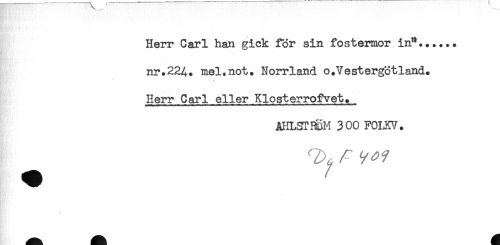 //// Herr Carl han gick för sin fostermor in"....., //// nr.224. mel.not. Norrland o.Vestergötland. //// Herr Carl eller Klosterrof vet. //// - //// AHLSTI&M 300 FOIRV. ////