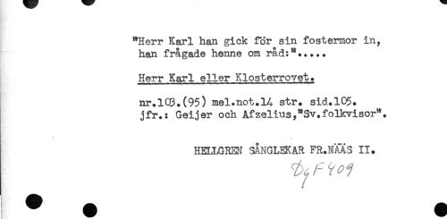 //// "Herr Karl han gick för sin fostermor in, //// han frågade henne om råd:"..... //// Herr Karl eller Klosterrovet. //// nr.103.(95) mel.not.14 str. sid.105. //// jfr.: Geijer och Afzelius,"Sv.folkvisor". //// HELLGREN SÅNGLEKAR FR.NÄÄS II. ////