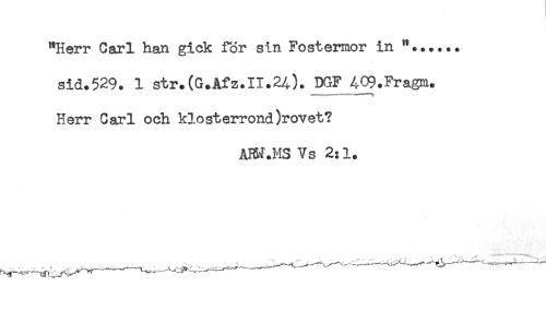 //// "Herr Carl han gick för sin Fostermor in "...... //// sid.529. 1 str.(G+Afz.II.24). DGF 4C9*Fragm. //// -—"*-—"" ..... //// Herr Carl och klosterrond)rovet? //// åm.HS Vs 2:1. ////