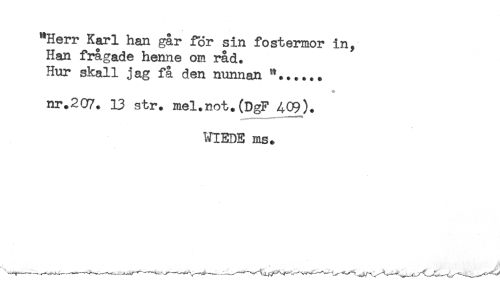 //// "Herr Karl han går för sin fostermor in, //// Han frågade henne om råd. //// Hur skall jag få den nunnan "...... //// o //// nr.207* 13 str. mel.not.(DgF 409). //// WIEDE ms. //// . * ' ////