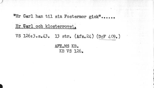 //// "Hr Carl han til sin Fostermor gick"...... //// Hr Uarl och klosterrovet. //// ...... " .....^ ........... - -.....<*« .... //// - ! //// VS 126:3.s.A3. 13 str. (Afz.2A) (DgF409.) //// t //// AFZ.MS KB. //// KB VS 126. //// . //// - //// H //// r- //// a //// a ////