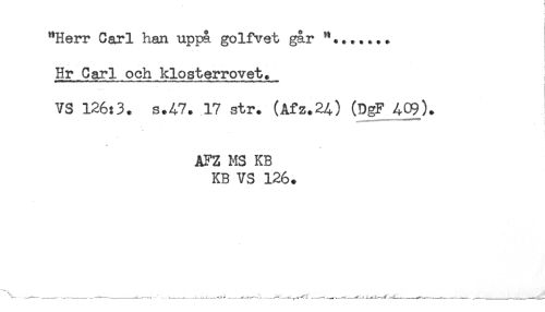 //// t //// t //// "Herr Carl han uppa golfvet gar //// Hr Carl och klosterrovet. //// i //// VS 126:3. S.A7. 17 str. (Afz.24) (DgF A09). //// AFZ MS KB //// KB VS 126. ////