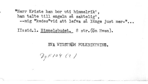 //// "Herr Kriste han bor uti himmelrik* , //// han talte till engeln så saktelig', //// —mig "kedes"vid att lefva så länge just mer-"... //// II:sid.1. Himmelsbudet. 8 str.(Sn Hven). //// ETA WIGSTR&M FOLKDIKTND^B. ////