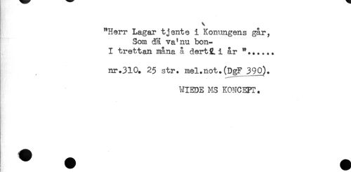 //// \ //// "Herr Lagar tjente i Konungens gar. //// Som dä va*nu bon- //// I trettan mana å dertt i år "*..... //// nr.310. 25 str. mel.not.(DgF 390). //// HIEDE MS KONCEPT. ////