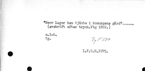 //// T //// } //// "Herr Lager han tjänte i konungens gård"...... //// (avskrift efter tryck.Vbg 1822.) //// J s.1-6. //// ^ I.F.G.H.3 075. //// A ^ ////