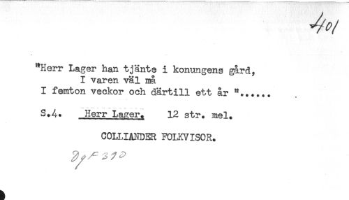 //// "Herr Lager han tjänte i konungens gård, //// I våren väl må //// I femton veckor och därtill ett år //// " " * * * //// S*^* Herr Laaer. 12 str. mel. //// COLLIANDER FOLKVISOR. ////