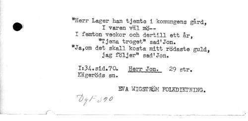 //// ^ "Herr Lager han tjente i konungens gård, //// ^ I våren väl mö— //// I femton veckor och dertill ett år, //// "Tjena troget" sad^Jon. //// "Ja,om det skall kosta mitt rödaste guld, //// jag följer" sad*Jon+ //// I:34*sid.70. Herr Jon. 29 str. //// Kägeröds sn. //// EVA WlGSTRdM FOLKDIKTNING. //// L__— r ___ __ _____ ____ ______,___ ////