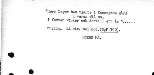 //// Herr Lager han tjänte i Konungens gård //// I våren väl mo, //// I femtan vi eker och dertill ett år //// i . - *' //// I nr.114. 24 str. mel.not. (DgF 390). //// . //// ) WIEDE MS. ////