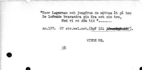 //// "Herr Lagerman och jungfrun de möttes åt på bro //// De loiaåde hvarandra sin ära och sin tro. //// Hed vi ro dom tid *..+.... //// nr.157. 27 str.mel.not.(DgF 124 //// MIEDE MS. ////