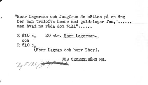 //// "Herr Lagerman och Jungfrun de möttes på en äng //// Der han trolofva henne med guldringar fem, ...... //// men hvad nu råda dom till"...... //// R 810 a, 20 str. Herr Lagerman. //// och //// R 810 c. //// (Herr Lagman och herr Thor). //// UUB CEDERSTHDMS MS. ////