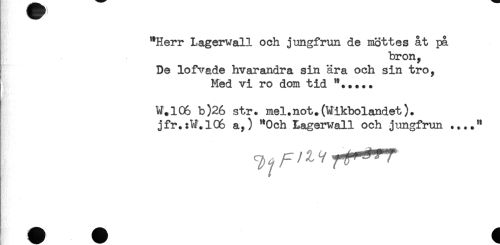 //// "Herr Lagervall och jungfrun de möttes åt på //// bron. //// De lofvade hvarandra sin ära och sin tro. //// Med vi ro dom tid "..... //// W.106 b)26 str. mel.not.(Wikbolandet). //// jfr. :W. 106 a,) "Och Lagervall och jungfrun ...." ////