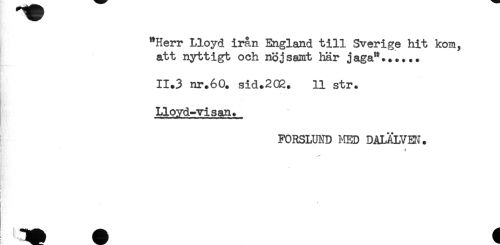 //// "Herr Lloyd irån England till Sverige hit kom, //// att nyttigt och nöjsamt här jaga"...... //// 11.3 nr.60. sid.202. 11 str. //// Lloyd-visan. //// FORSLUND I4ED DALÄLV3J. //// åf ' * //// i //// i //// ) ////