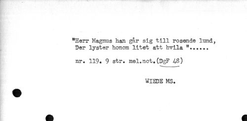 //// "Herr Magnus han går sig till rosende lund, //// Der lyster honom litet att hvila ...... //// nr. 119. 9 str. mel.not.(DgF 48) //// WIEDE MS. ////