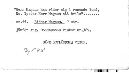 //// "Herr Magnus han rider sig i rosende lund? ! //// Det lyster Herr Magnus att hvila"........ //// nr.55* Riddar Ma.gnus. 7 str* //// jämför Aug* Bondessons visbok nr.387. //// SAME GOTLANDSKA VISOR. //// ^ ;; - ^ //// " -- ---mmr-tn I---' ////