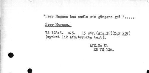 //// HM' ' # //// "Herr Magnus han sadla sin gångare grå "..... //// * * * - - ; . ... - //// Herr Magnus. //// VS 126:3. s.5. 15 str.(Afz.l2)(DgF 206) //// (mycket lik Afz.tryckta text). //// AFZ.Ms Kb //// KB VS 126. ////