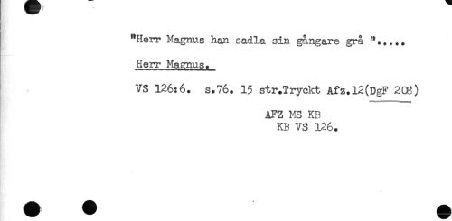 //// "Herr Magnus han sadla sin gångare grå //// - //// Herr Magnus. //// VS 126:6. s.76. 15 str.Tryckt Afz.l2(DgF 206) //// AFZ MS KB //// KB VS 126. ////