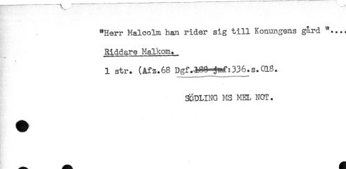 //// "Herr Malcolm han rider sig till Konungens gård "...< //// Riddare Malkom. _ //// 1 str. (Afz.68 Dgf.3^-^*:336.s.0l8. //// S&DLING MS MEL NOT. ////