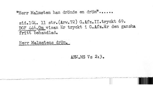 //// "Herr Malmsten han drömde en dröm"...... //// sid.1%. 11 str.(Arw.72) G.Afz.II.tryckt 69. //// DGF /^6.0m visan är tryckt i G.Afz.är den ganska //// fritt behandlad. //// Herr Malmstens dröm. _ //// ABJ.I4S Vs 2:3. //// —^ —---—---- — jjj ////