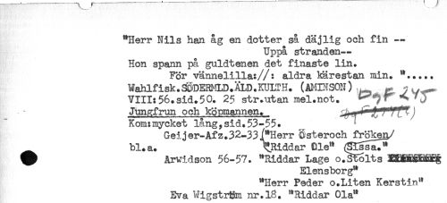 //// "Herr Nils han åg en dotter så däjlig och fin — //// Uppå stranden- //// Hon spann på guldtenen det finaste lin. //// För vännelilla://: aldra kärestan min. "..... //// Wahlf i sk. KN3EHMLD. ÄLD. KULTH. (AMBISON) ^ ^ ^ //// VIII:56.sid.50. 25 str.utan mel.not. < J //// Jungfrun och köpmannen. : //// Komtmycket lång,sid.53-55. ^ //// Geijer-Afz.32-33i"Herr C-steroch^ökea/ //// bl. a. t.Riddar Ble" (SgsaT" //// ^^ Arvidson 56-57. "Riddar Lage o.S^olts IS^SiÉ^ //// Elensborg" //// "Herr Peder o.Liten Kerstin" //// Eva WlgstrSm nr. 18. "Riddar Ola" ////