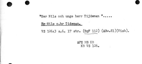//// "Her Nils och unge herr Tijdeman //// Hr Nils o.hr Tideman. //// VS 126:3 s.6. 17 str. (DgF 112) (åRw.3l)(Visb). //// AFZ MS KB //// KB VS 126. ////