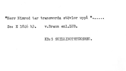 //// "Herr Nimrod tar t ran smorda stovlor uppå ..... //// Se: E 1846 h3. v.Bratm enl.LUB. //// KB:S SKILLINGT3YCKSRB5. ////