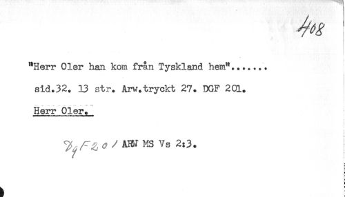 //// "Herr Oler han kom från Tyskland hem"....... //// i //// sid.32. 13 str. Arv.tryckt 27. DGF 2d. //// Herr Oler. //// : //// : //// ^ / AW MS Vs 2:3. //// h //// r //// t //// < ////