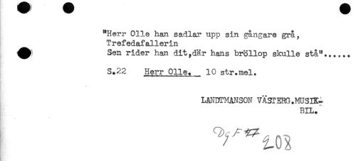 //// "Herr Olle han sadlar upp sin gångare grå, //// Trefedafallerin //// Sen rider han dit,där hans bröllop skulle stå"..... //// S*22 Herr Olle. 10 str.mel. //// LANDTMANSON VÄST ERG.MUSIK- //// BIL. //// . //// - ////