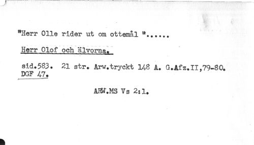//// ..... //// "Herr Olle rider ut om ottemål "...... //// Herr Olof och älvorna. //// sid.583. 21 str. Arv.tryckt 148 A. G.Afz.II,79-80. //// DGF 47. //// ** //// AHW.MS Vs 2:1. ////
