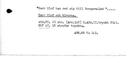 //// ^ "Herr Olof han red sig till Borgare-led "..... //// Herr Olof och älvorna. //// sid.85. 20 str. (Arw.148) G.Afz.II.tryckt 80:1. //// DGF 47. 18 strofer tryckta. //// ABM.MS Vs 2:3. ////