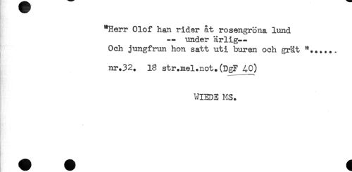 //// "Herr Olof han rider åt rosengröna lund //// — under ärlig— //// Och jungfrun hon satt uti buren och grät //// nr.32. 18 str.mel.not.(DgF 40) //// WIEDE MS. //// - //// * //// : ////