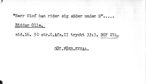 //// "Herr Olof han rider sig söder under ö"..... //// Riddar Olle. //// < //// . //// sid.16. 50 str.G.Afz.II tryckt 33:3. DGF 274. //// GÖT.^RB.KVHAA. //// - ////