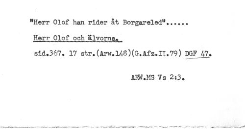 //// "Herr Olof han rider åt Borgareled"...... //// Herr Olof och älvorna. //// sid.367. 17 str.(Årw.H8)(G.Afz.II.79) DGF 47* //// ÅSW.HS Vs 2:3. ////