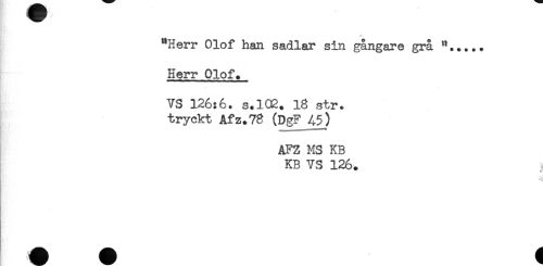//// ^^^ / //// "Herr Olof han sadlar sin gångare grå "..... //// Herr Olof. //// VS 126:6. s.102. 18 str. //// tryckt Afz.78 (DgF 45) //// AFZ MS KB //// KB VS 126. ^ ////