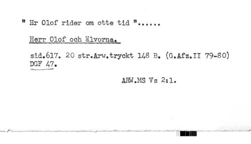 //// Herr Olof och älvorna. //// sid.617. 20 str.Arv.tryckt 148 B. (G.Afz.II 79-80) //// DGF 47. //// AIM.HS Vs 2:1. //// ------. ------- ** * ' Hmmn ////