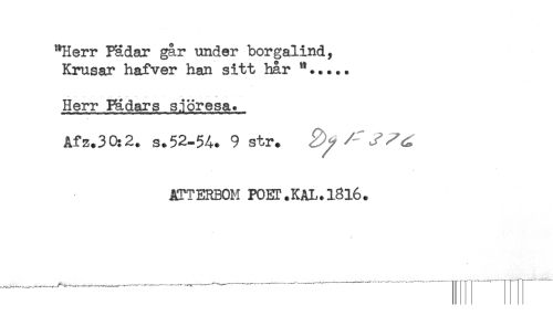 //// "Herr Pädar gar under borgalind, //// Krusar hafver han sitt hår //// Herr Fädars sjöresa. //// Afz.30:2. s*52-54. 9 str. ^ //// ATTERBOH POET .KAL. 1816. ////
