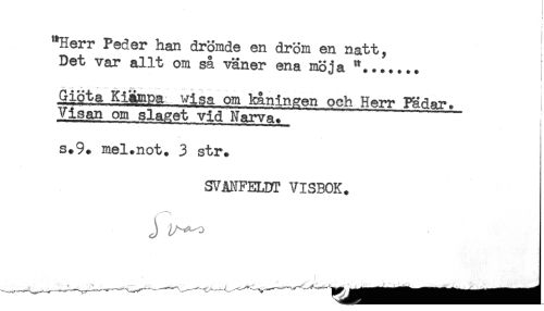 //// f //// "Herr Peder han drömde en dröm en natt, //// Det var allt om så vaner ena mö ja "....... //// Giöta Kiä&pa wisa om kåningen och Herr PSr^?*. j //// Visan om slaaet vid Narva. "- //// s.9* mel.not. 3 str. //// SVåNFELDT VISBOK. //// j ////