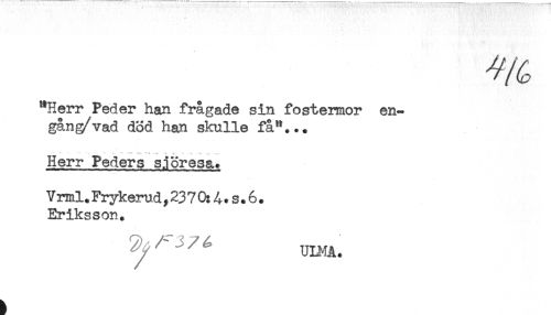 //// "Herr Peder han frågade sin fostermor en- //// gång/ vad död han skulle få"... //// Herr Peders sjöresa. //// Vrml.Frykerud,2370:4. s.6. //// Eriksson. //// ^ UIMA. ////