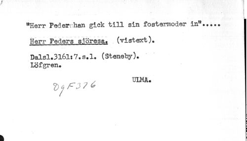 //// "Herr Pederrhati gick till sin fostermoder in"..... j //// Herr Peders sjöresa, (vistext). j //// Dalsl.3l6l:7.s.l. (Steneby). ! //// Löfgren. ! //// ULMA. ////