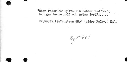 //// "Herr Peder han gifte sin dotter med Tord, //// han gav henne gull och gröne jord".*.... //// Ek.nr.l9.(Se"Hustrun dör" -äldre Folkv.) Bs/. ////