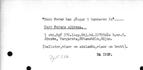 //// "Herr Peder han gångar i kammaren in"..... //// Herr Peders sjöresa. //// 1 str.DgF 376*Insp.Rtj.bd.33769:Ss b.nr.5* //// Jönzén, Margareta,Rätansböle,Röjan. //// - //// (ballader,visor om adelsmän,visor om brott). //// A ^ ////