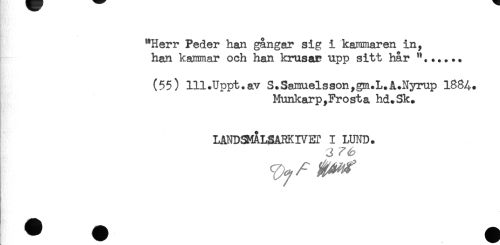 //// * //// (55) lll.Uppt.av S.Samuelsson,gm.L.A.Nyrup 1884. //// Munkarp,Frosta hd.Sk* //// MNDSMALSARKIVET I LUND. //// 3 7 <6? ////