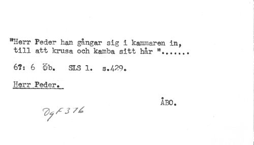 //// t //// < //// } //// t //// "Herr Peder han gångar sig i kammaren in, I //// till att krusa och karnba sitt hår //// 6?: 6 S'b. SLS 1. s.429. //// Herr Peder. //// ÅBO. //// ^ ,. - //// < ////