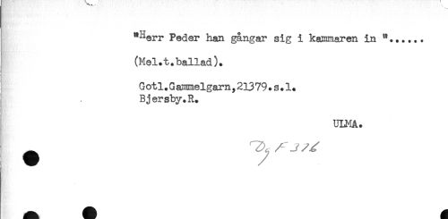 //// "Sgrr Peder han gångar sig i kammaren in //// (Mel.t.ballad). //// Gotl.Ganrnielgarn,21379. s.l. //// Bjersby.R. //// ULMA. ////