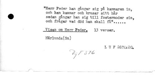 //// "Herr Peder han gångar sig på kammaren in, //// och han kammar och krusar sitt hår //// ^ sedan gångar han sig till fostermoder sin, //// och frågar vad död han skall få"...... //// Visan om Herr Peder. 13 verser. //// Härlunda(Sm) //// L U F 2674:20+ //// / //// -, ////
