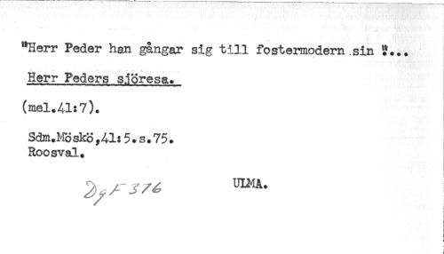 //// "Herr Peder han gångar sig till fostermodern sin //// * //// Herr Peders sjöresa. //// (mel.41:7). //// Sdm.MHskSyAl:5.s.75* //// Roosval. //// J^^JV^ UIMA. : //// ! ////