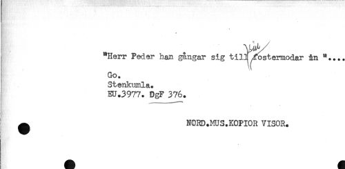 //// t //// , "Herr Peder han gängar sig til^ostermodar ån *.... //// Go. //// Stenkumla. //// EH+3977. DgF 376. //// ^ NORD.MUS.KOPIOR VISOR. ////